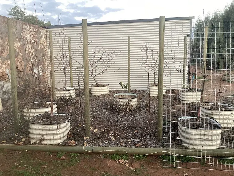 That's where the joy of this garden ended. My dog started getting into the garden and digging and making a mess, and ate my little banana pup. I put the green garden wire around to stop him, and it did, he saw that as a "not allowed in there" and didn't go in there anymore even though he could have jumped over it easily enough. Then I got stuck puppy sitting someone else's dog, and that dog had no issues with jumping the little garden fence and digging things up, and my dog decided that looked like fun and started doing it too, and he kept doing it even after the other dog was gone. I put chicken wire around the garden to keep him out, and that worked for a while, but he eventually figured out how to tear it down, and he also figured out how to tear down the wires supporting the trees. Then a few extreme thunderstorms killed the solar lights and the remaining wires supporting the trees, the dog kept getting in and digging holes, the trees went dormant at the start of winter, and the only thing left growing in the garden was a new little mandarin tree and loads of disappointment.
